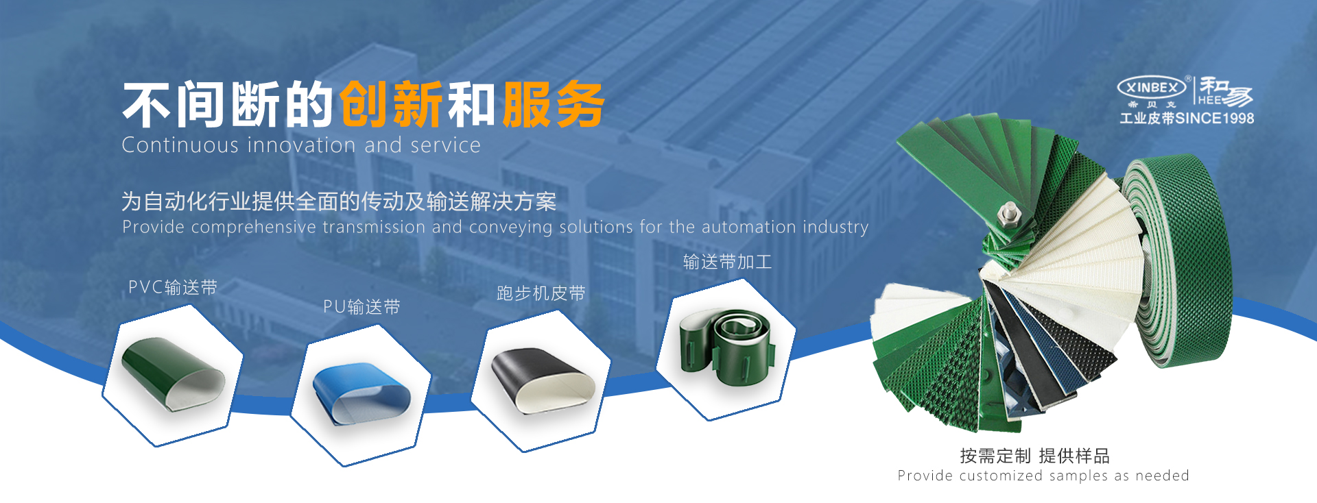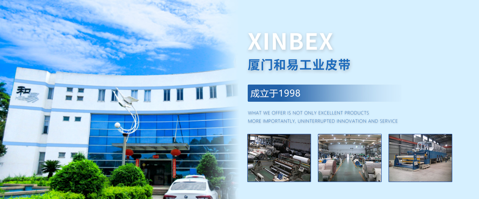 廈門(mén)和易工業(yè)皮帶有限公司XINBEX成立于1998年,是一家集研發(fā)、生產(chǎn)、服務(wù)于一體的專(zhuān)業(yè)工業(yè)帶公司。擁有自己的品牌,引進(jìn)了先進(jìn)的技術(shù)和生產(chǎn)設(shè)備。質(zhì)量管理體系已通過(guò)iso9001:2008認(rèn)證,產(chǎn)品質(zhì)量已通過(guò)SGS認(rèn)證。2021年,公司被評(píng)為國(guó)家高新技術(shù)企業(yè)(GR202135100917)。